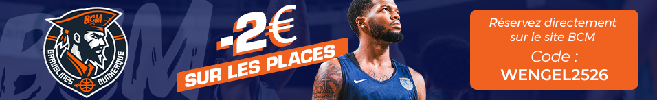 Profitez d'une remise de 2€ sur vos places de match Réservez directement sur le site Billetterie BCMCode : WENGEL2526 Hors matchs de gala INFORMATIONS 59820 Gravelines Itinéraire 03 28 51 97 00 Site WebCalendrier des matchs et marche à suivre pour la réservation